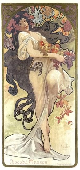 本作品《秋》は、ショコラ・マッソン社の依頼により制作された連作《四季》の一枚で、春・夏・秋・冬をそれぞれ異なる女性像で表現しています。1890年代のパリでは、ミュシャが手掛けたポスターや装飾的リトグラフが大きな人気を集め、ショコラ・マッソンのような高級商店は、商品の販促用にこうした芸術的なポスターを積極的に採用していました。